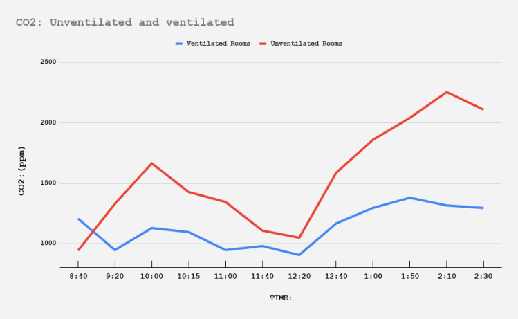 The data presented below is displayed on a graph showing both the data for unventilated rooms (red) and ventilated rooms (blue). The difference between both lines is seen quite clearly. (red line going down between 11:00AM and 12:20PM is due to a change in classroom for measurements).