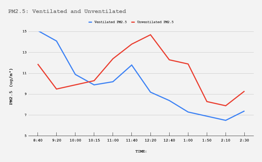 For the Classroom Air Quality (CAQ) study at Vienna International School, I measured PM2.5 concentration in a particular classroom – comparing the classroom air quality when the classroom was ventilated frequently (blue line) with the situation on another day when the classroom was not ventilated (red line).